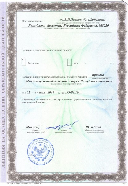 | Адрес местонахождения образовательной организации* | 368220, Республика Дагестан, город Буйнакск, улица Ленина, 42 |